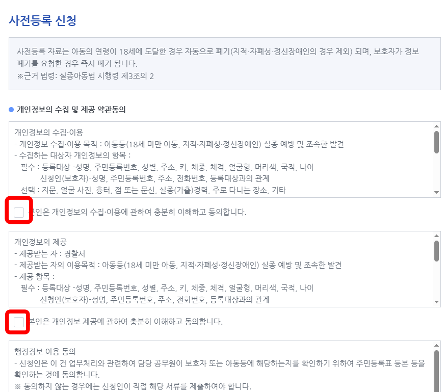 사전등록 신청 안내 아동·여성·장애인 경찰지원 센터에서는 아동등의 실종을 방지하고 실종발생 시 신속한 발견을 위해서 사전등록제를 운영하고 있습니다. 신청하러 가기