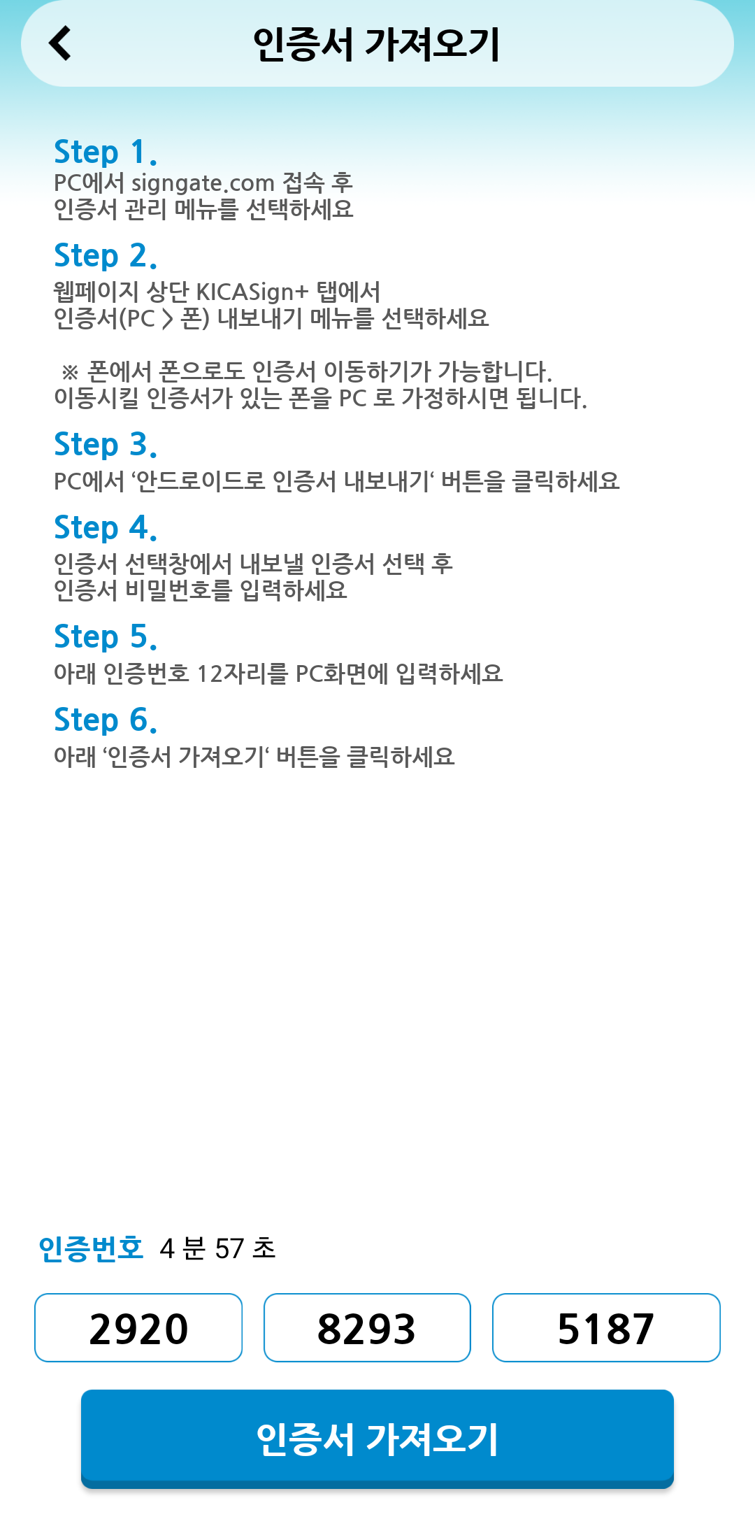 PC에서 발급받은 공동인증서를 스마트폰으로 옮기거나,