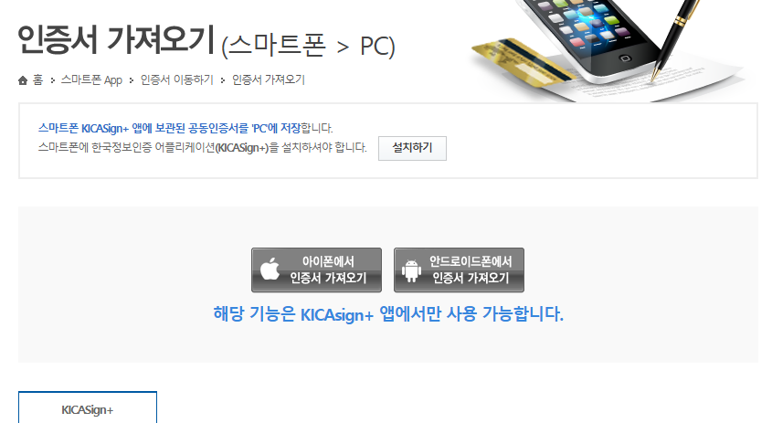 그 다음 컴퓨터에서 인증서 가져오기 메뉴로 들어간 뒤 아이폰/안드로이드 가져오기를 누른다.