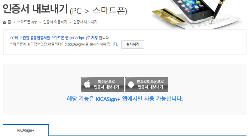 한국정보인증 홈페이지에서 스마트폰 인증서 복사탭을 누른다 (오른쪽 탭에 있음)