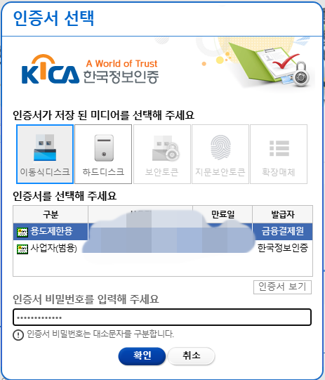 내보내기를 누른 뒤 인증서를 선택하고 암호를 입력한다.