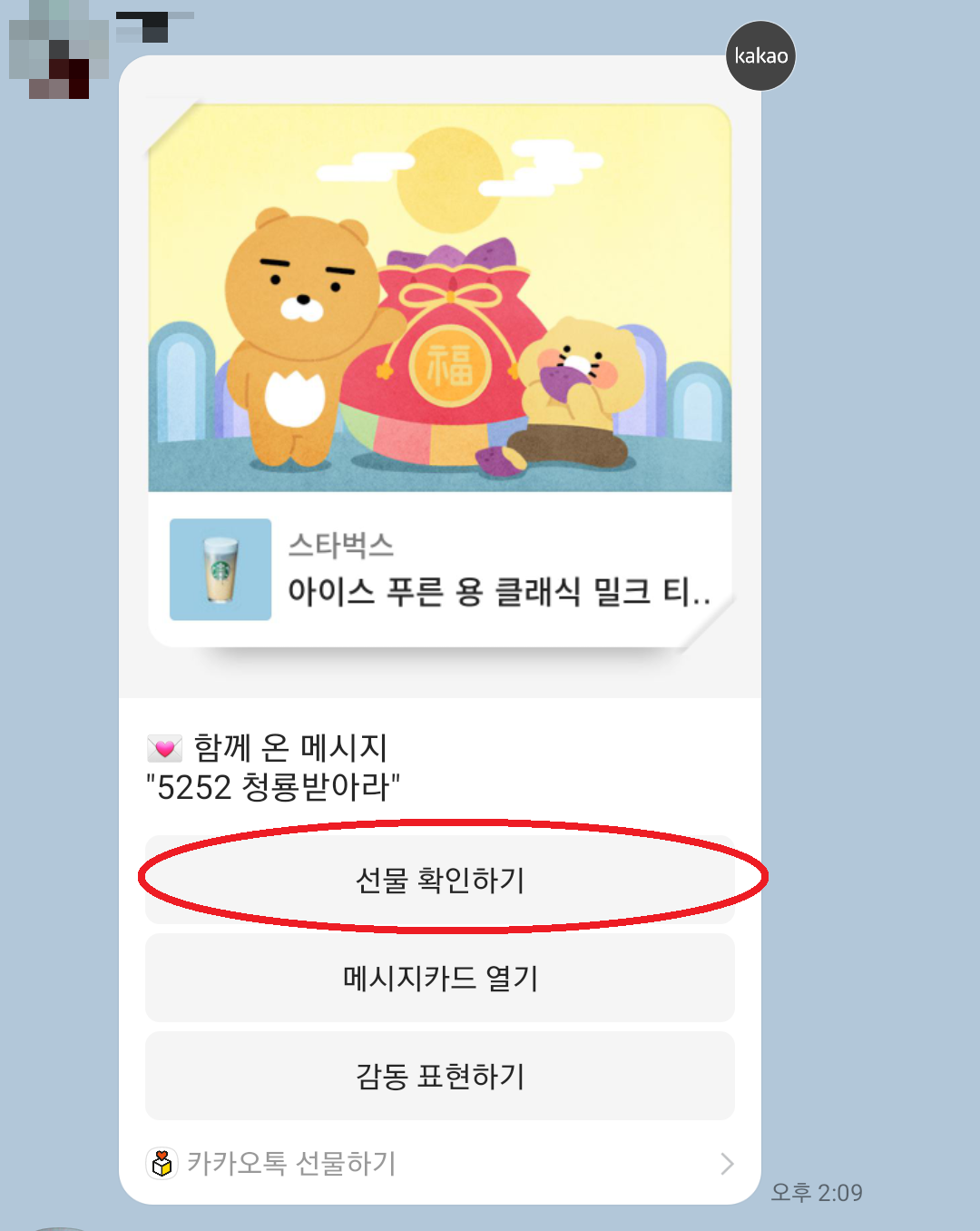 선물하기를 누르면 카카오톡 선물하기 화면이 나옵니다.