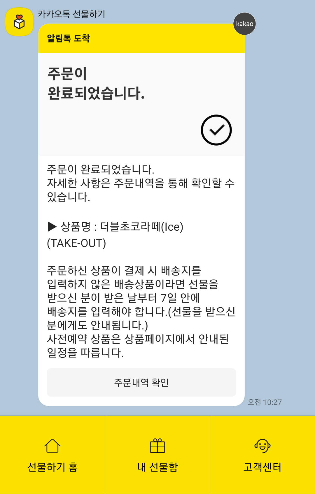 주문확인 카카오톡이 옵니다. 선물하기 완료입니다.