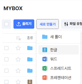새로 만들기 버튼 클릭 → 한글, 워드, 시트, 프레젠테이션 중 원하는 형식을 선택.