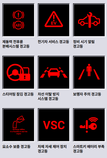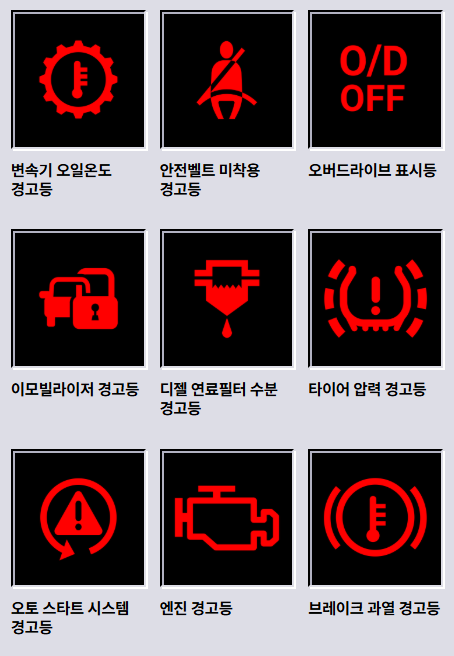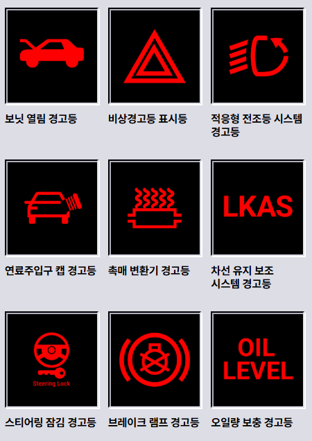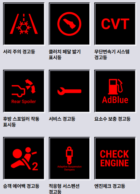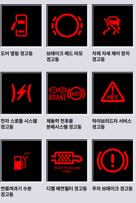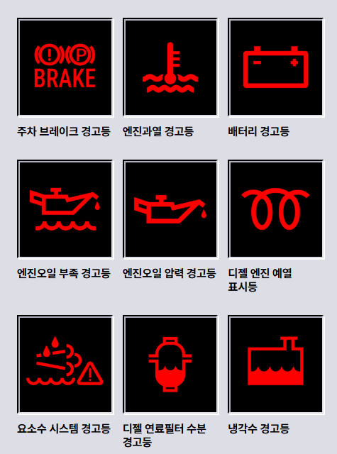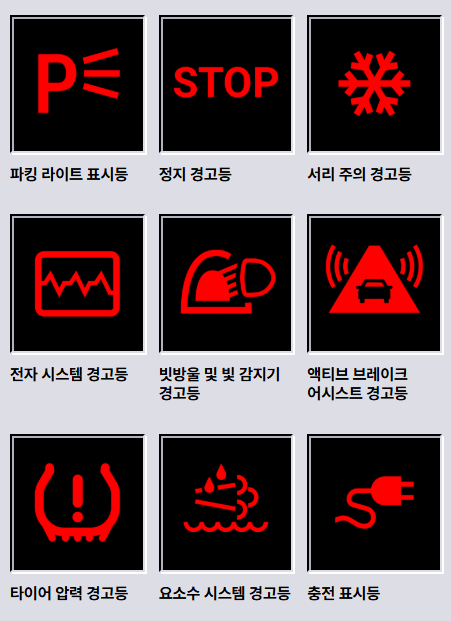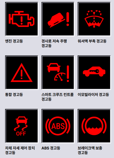| 빨간색 | 위험(즉시 점검 필요) | 브레이크 경고등, 배터리 경고등 |