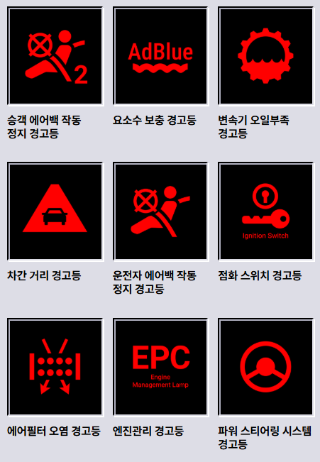 | 주황색 | 주의 | 엔진 경고등, 타이어 공기압 경고등 |