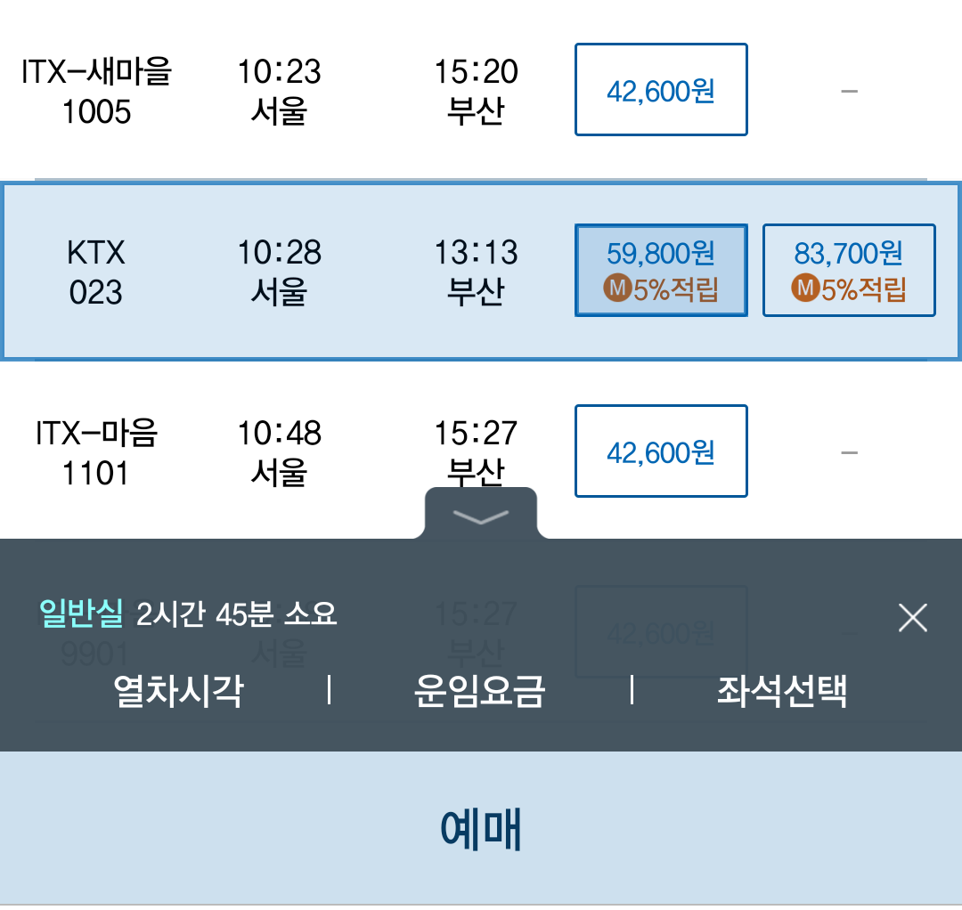 누르면 열차시각, 운임요금, 좌석선택, 예매가 나옵니다.