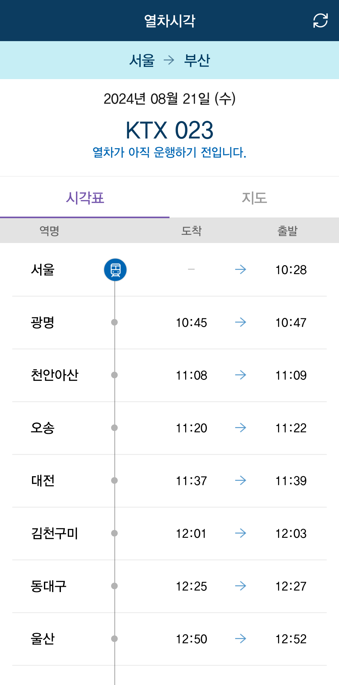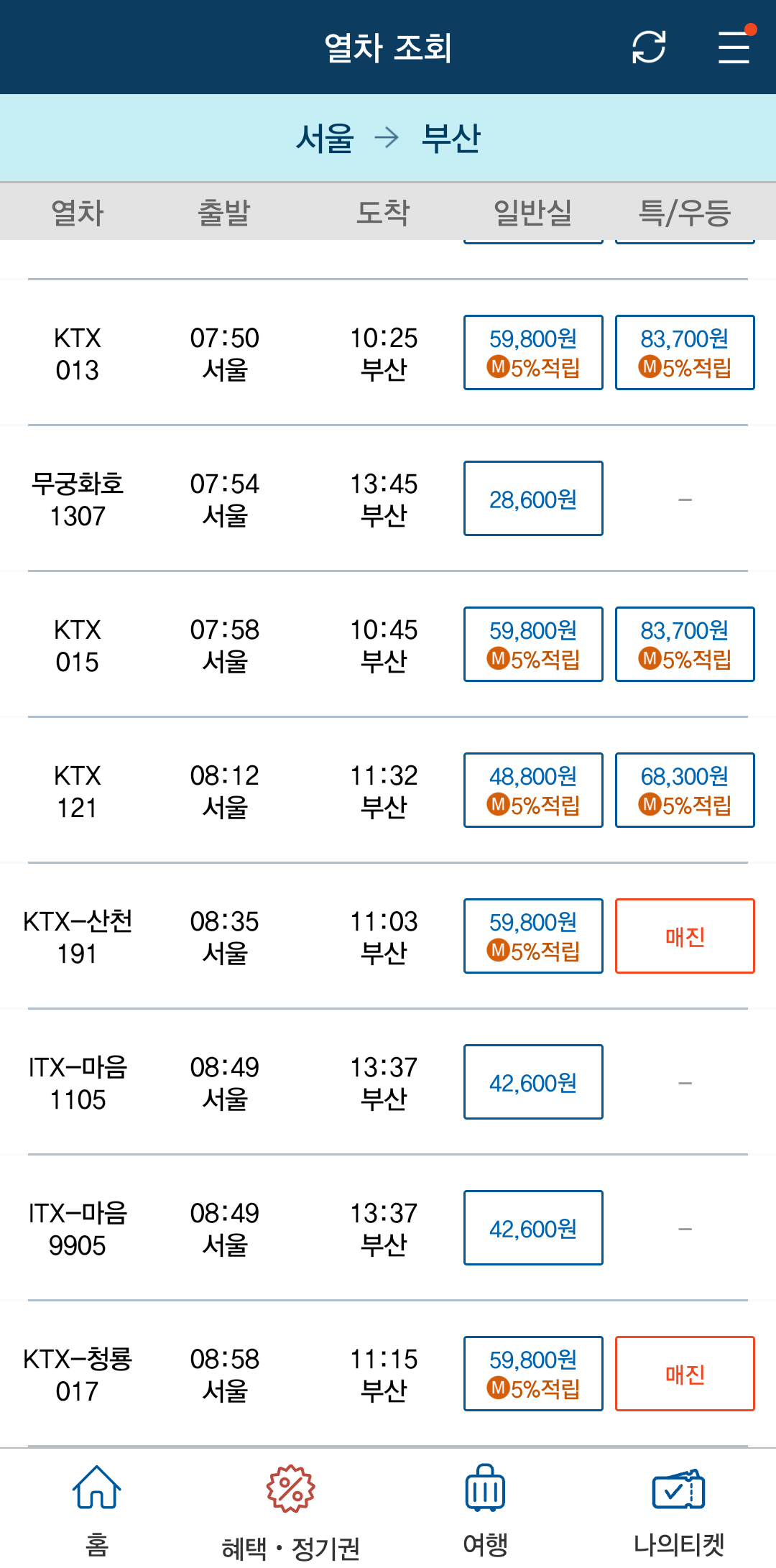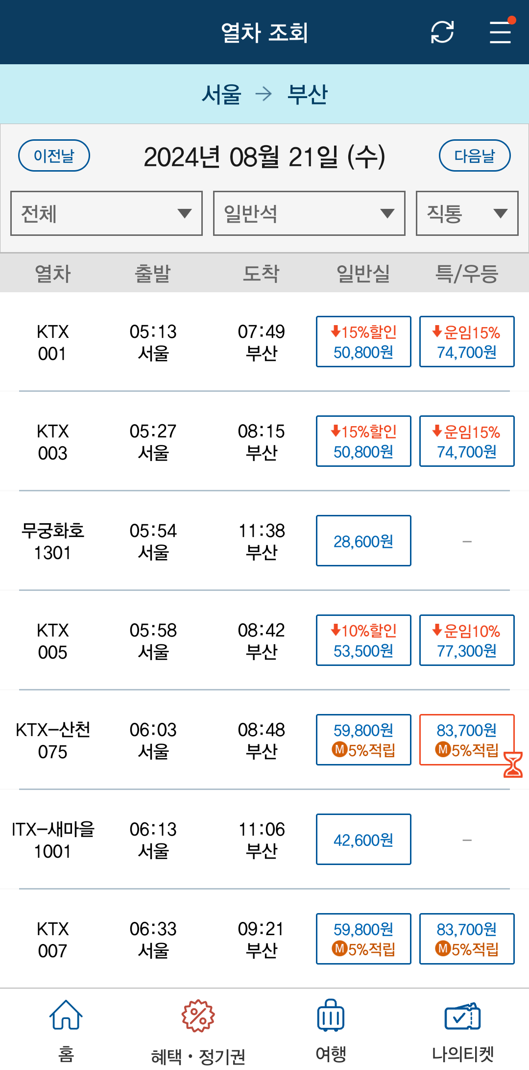 저는 우선 서울에서 부산행을 찍어볼게요.