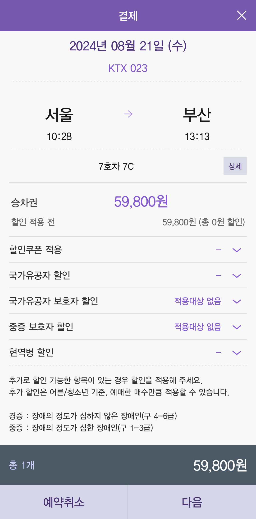예매하기를 누르면 승차권 정보 확인이 나옵니다.